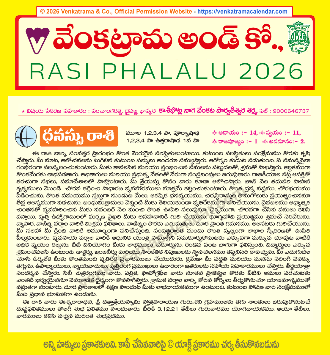 Dhanussu Rasi Phalithalu 2026 Yearly Predictions in Telugu ధనస్సు రాశి 2026 సంవత్సర రాశి ఫలములు Telugu Rasi Phalalu 2026 Venkatrama & Co Gochara Phalithalu 2026 Copyrights