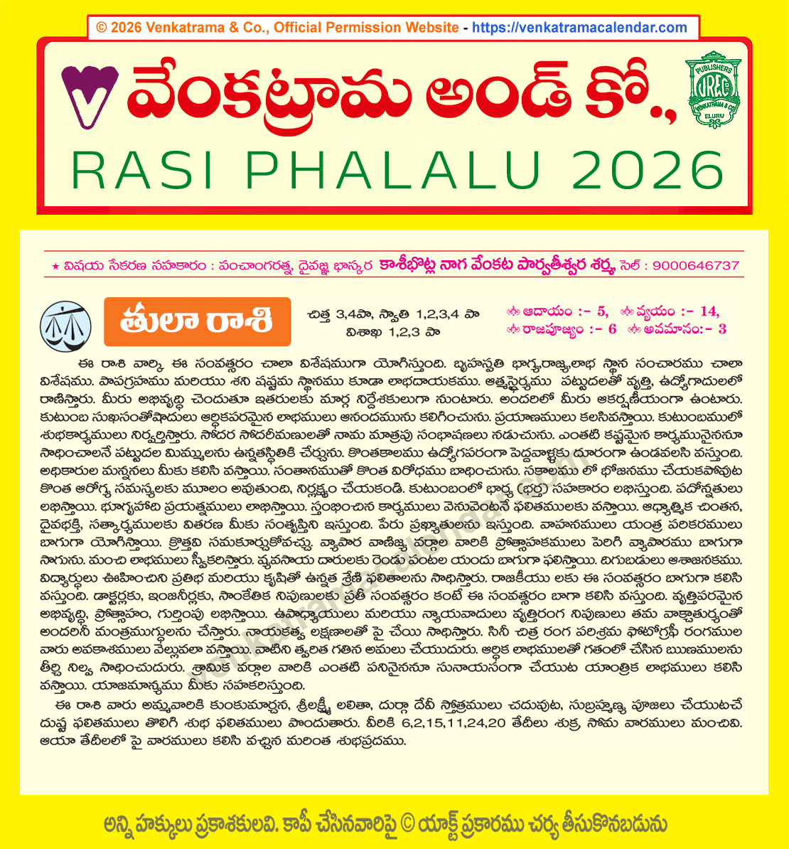 Tula Rasi Phalithalu 2026 Yearly Predictions in Telugu తులా రాశి 2026 సంవత్సర రాశి ఫలములు Telugu Rasi Phalalu 2026 Venkatrama & Co Gochara Phalithalu 2026 Copyrights