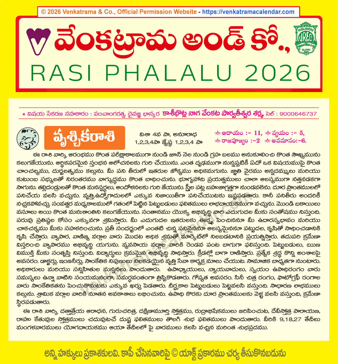 Vruschika Rasi Phalithalu 2026 Yearly Predictions in Telugu వృశ్చిక రాశి 2026 సంవత్సర రాశి ఫలములు Telugu Rasi Phalalu 2026 Venkatrama & Co Gochara Phalithalu 2026 Copyrights