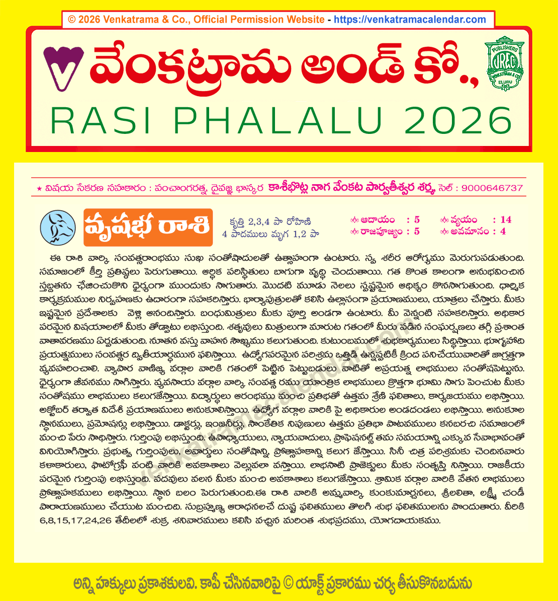 Vrushabha Rasi Phalithalu 2026 Yearly Predictions in Telugu వృషభ రాశి 2026 సంవత్సర రాశి ఫలములు Telugu Rasi Phalalu 2026 Venkatrama & Co Gochara Phalithalu 2026 Copyrights